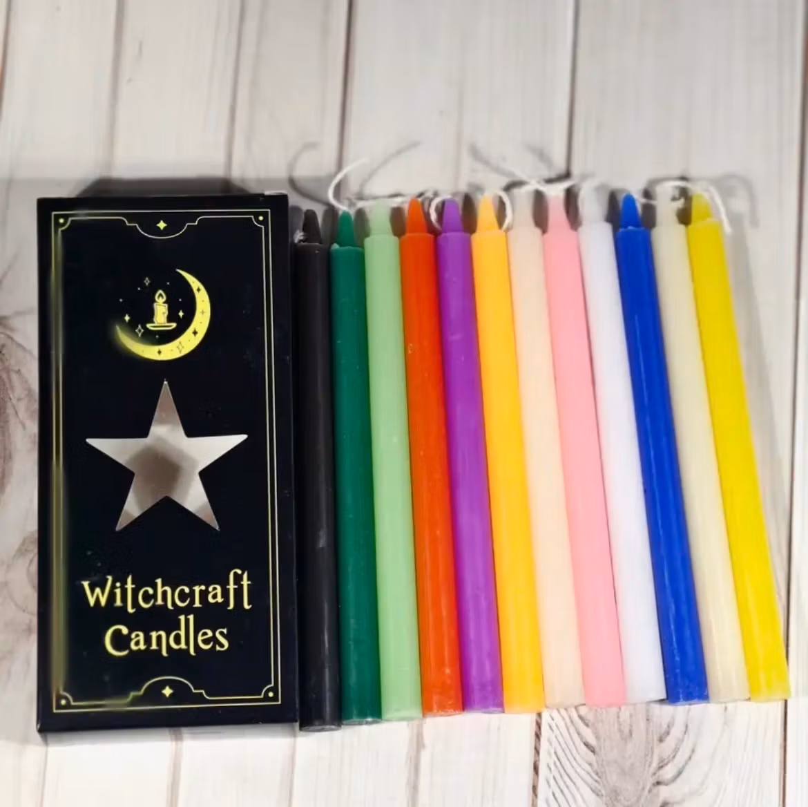 följande färger; x2 svart för förvisande negativitet, x2 vit för läkning, x1lila för stress mindre, x1 gul för lycka, x1 orange för attraktion, x1 brun för jordning, x1 röd för passion, x1green för överflöd, x1 rosa för självkärlek och x1 blå för harmoni. Ljusen är enfärgade hela vägen igenom (inte doppade). Varje ljus har en ca brinntid på 1 timme. Tillverkad av paraffinvax.