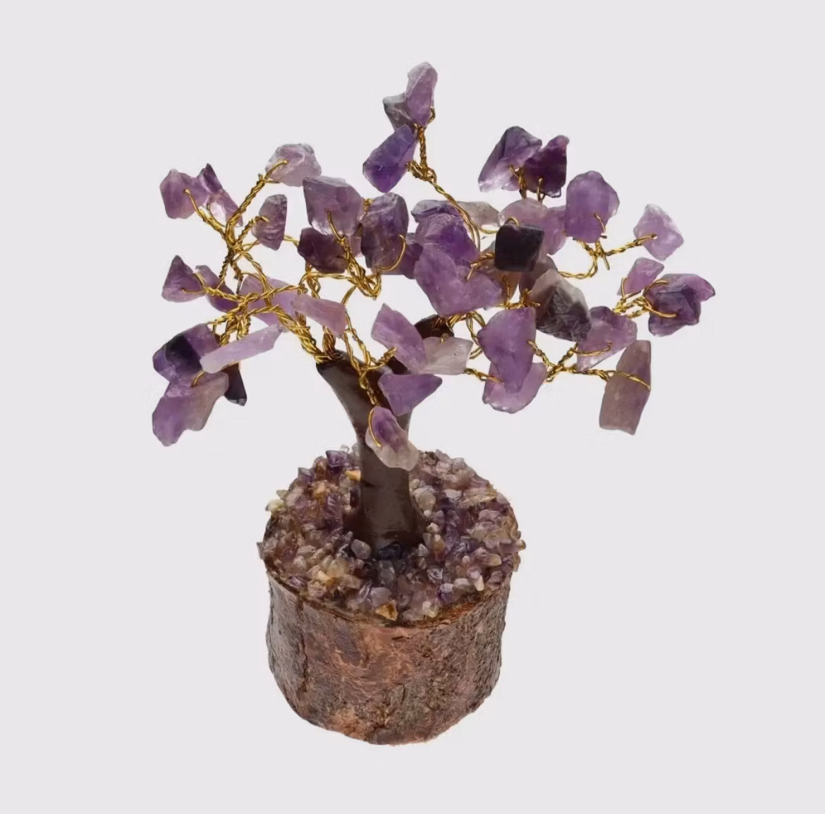 Litet kristallträd med ametist, trädet är ca 11cm högt. Basen som trädet står på är av trä med små ametistkristaller