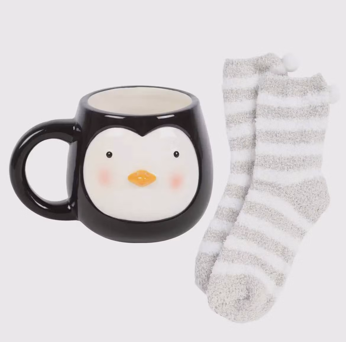 Sötaste julkombon, Svart mugg som set ut som en pingvin och ett par mjuka, randiga strumpor med en liten boll på. Muggen har 500ML kapacitet. endast handtvätt.