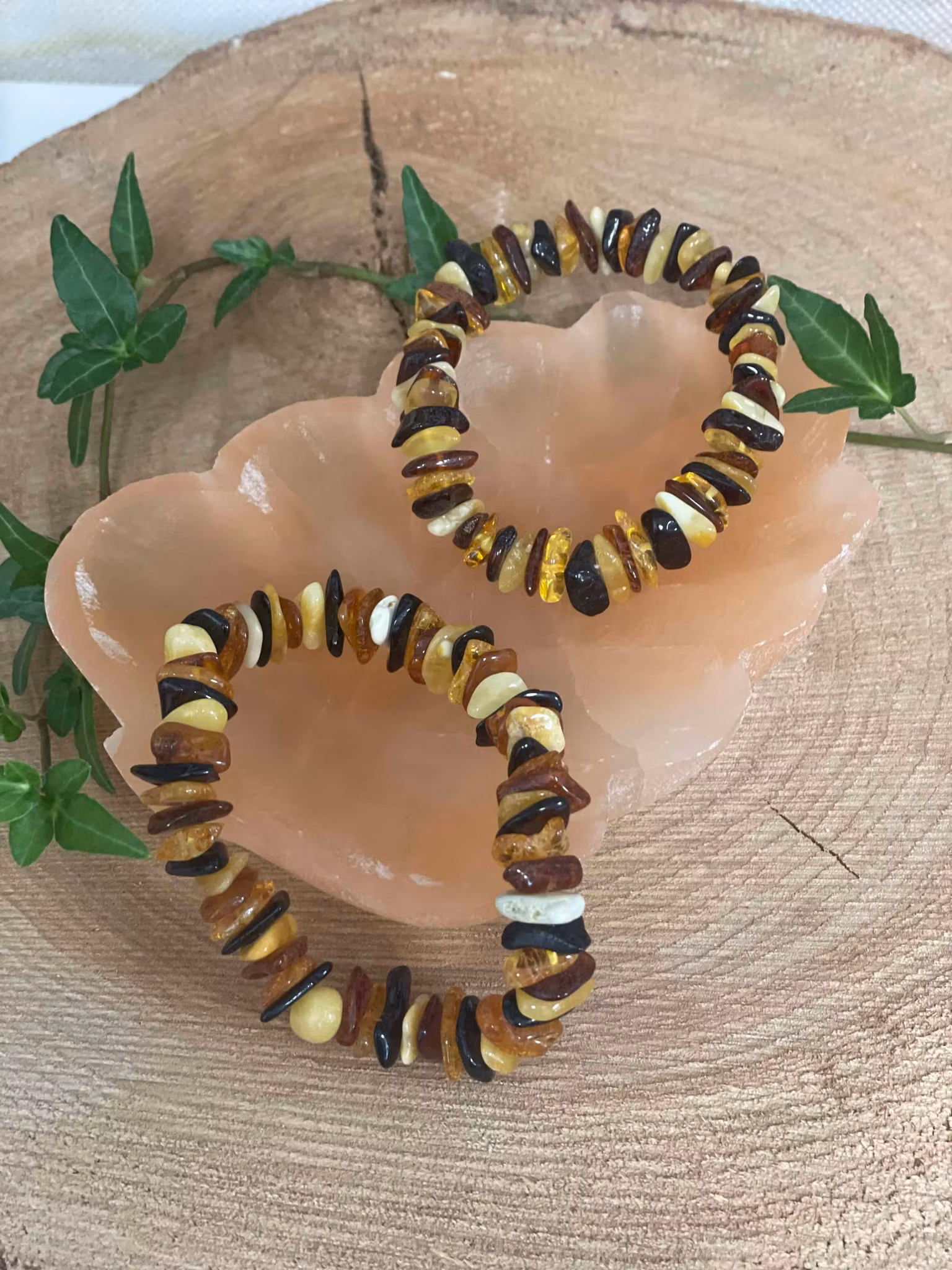 Vackert Bärnstens armband med bärnsten i olika nyanser. Detta armband kommer i från Polen och har ett elastiskt gummiband.