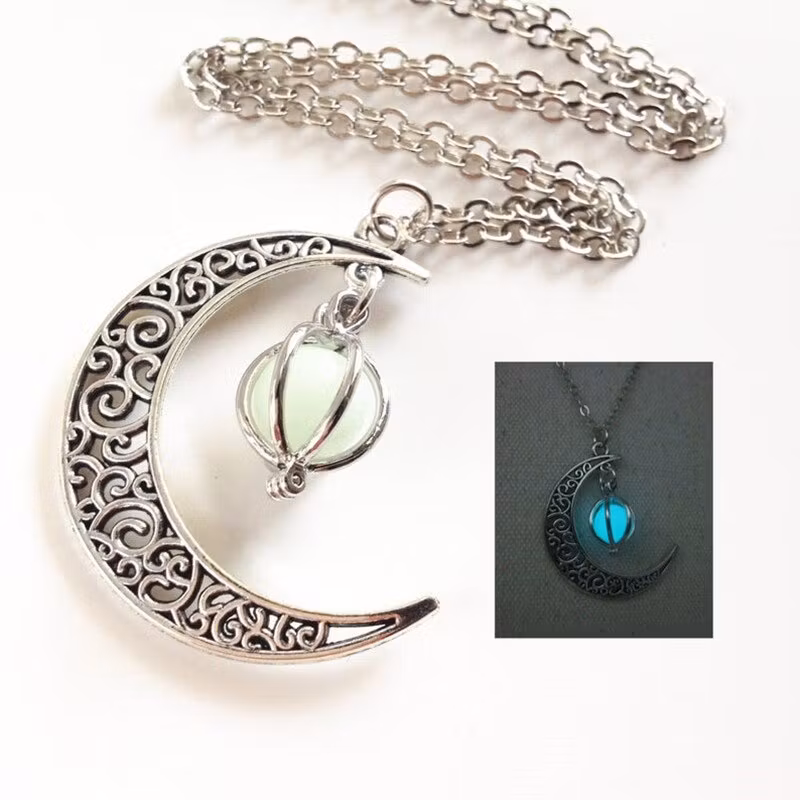 Halsband med måne som lyser i mörkret. Ladda upp det mot en lampa för att få extra starkt ljus. Kedjans längd är 50mm. Halsbandet består av en silver legering så kan innehålla nickel. Säljs styckvis.