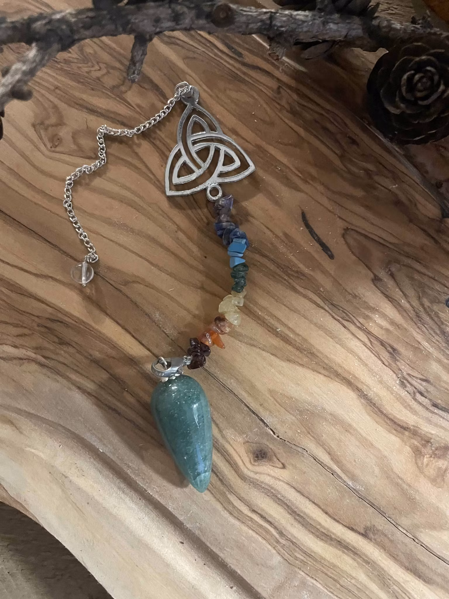 Vacker pendel med grön aventurin och små chakra kristaller. Pendeln har också en valknut och en pärla. Detta är inte en pendel om man är nybörjare då det kan behövas lite övning att få den att pendla.