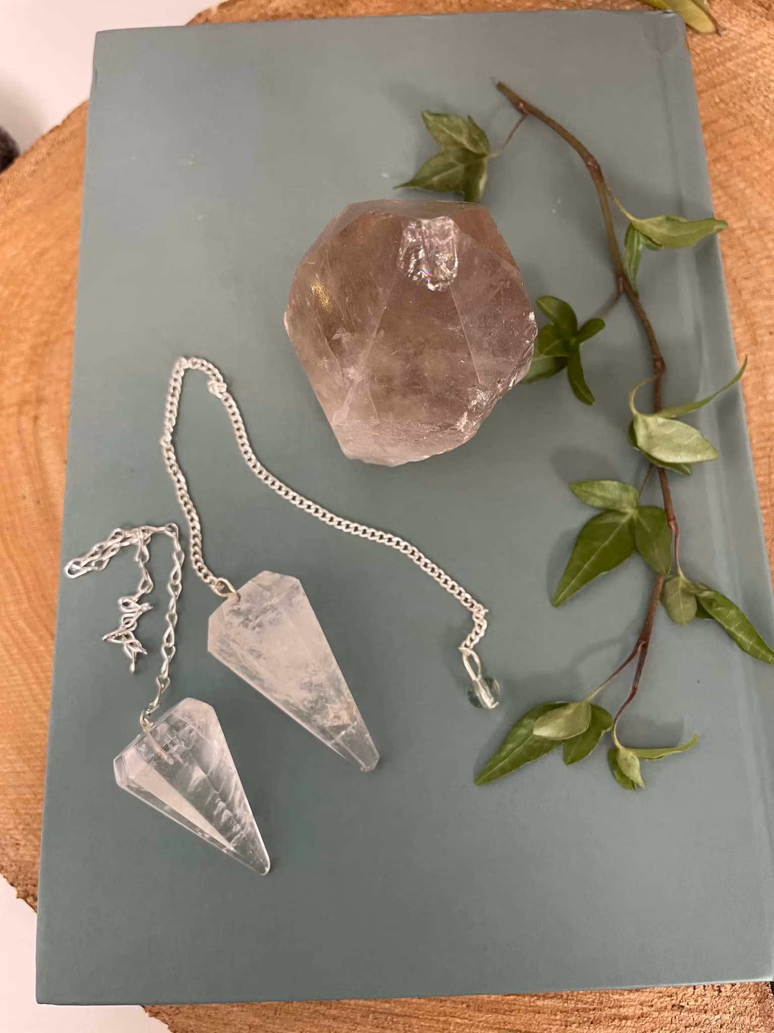 en slipad bergkristalls pendel som kan användas för att ställa frågor till ens undermedvetna eller att göra en chakra balans utredning. Säljs styckvis.