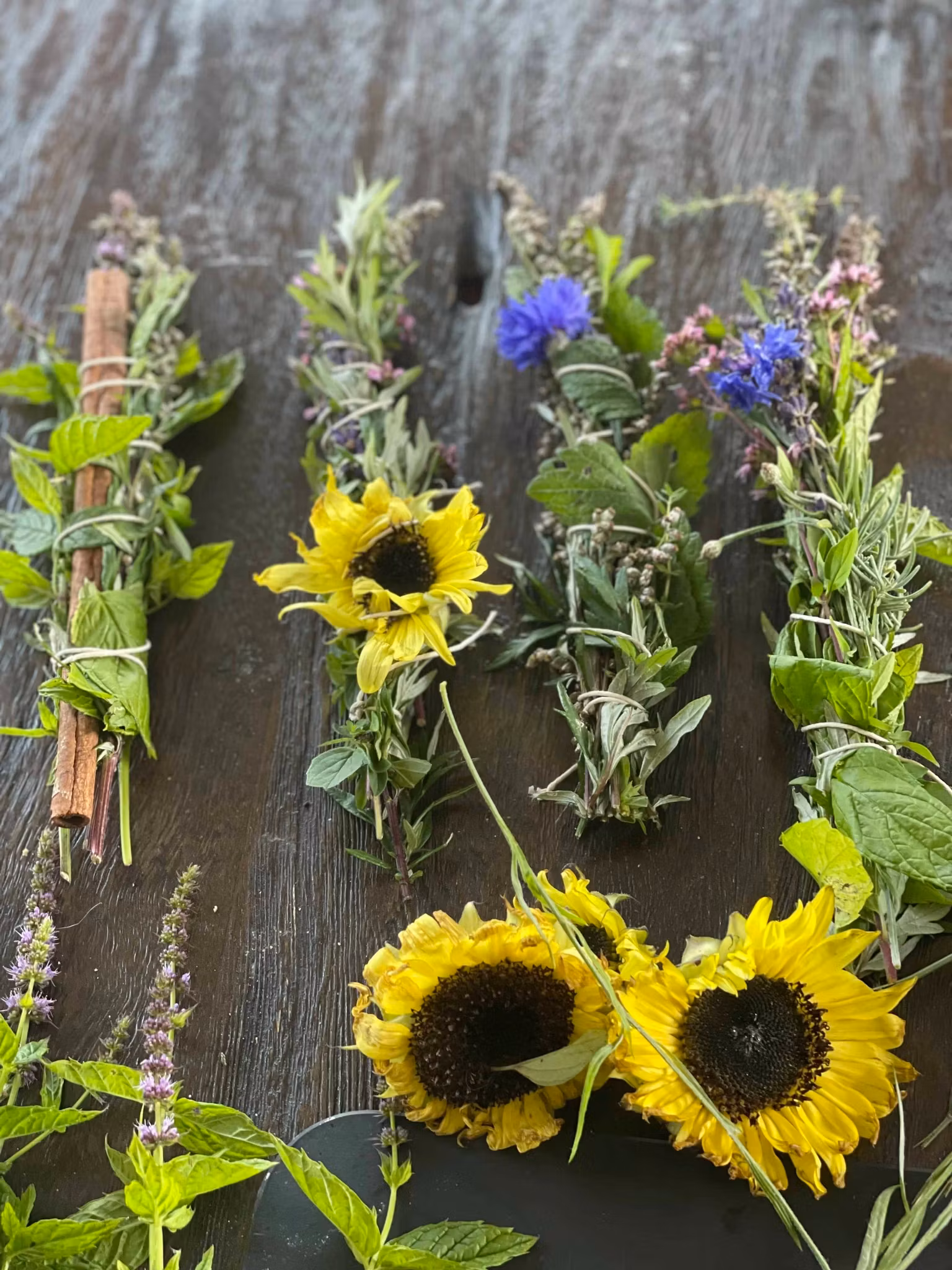 Buntarna är bundna med färska örter, blommor och gråbo från egen trädgård. Vissa buntar innehåller även kanelstång. Jag kollar dem sensommar buntar och de innehåller rosmarin, mynta, gråbo, blåklint, lavendel, oregano, rölleka, solros och kanel. Dess rökelsebuntar passar bra till hösten när förkylningar och trötthet kryper sig på. Jag binder dem helt själv med örter och blommor från egen trädgård. Välj typ av rökelsebunt.