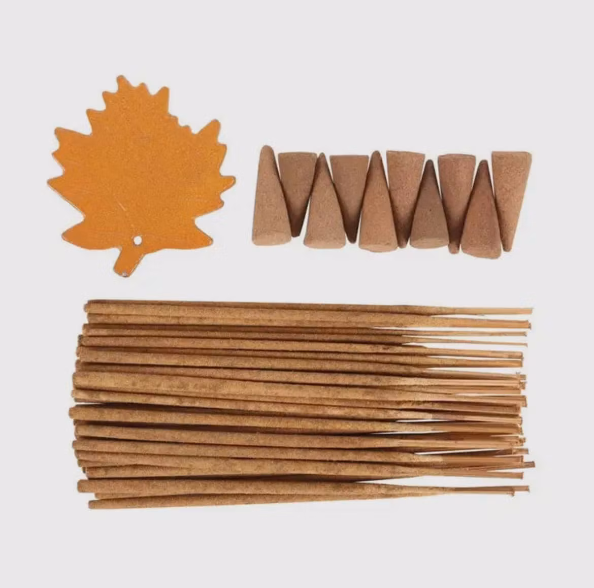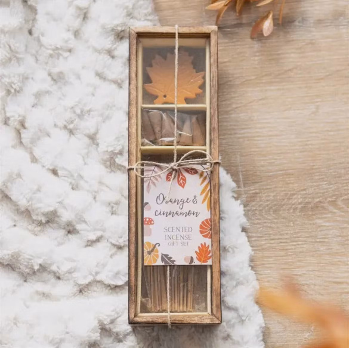 Maximal myskänsla med denna boxen! Innehåller både pinnar och konor med doft av höst apelsin och kanel. En rökelsehållare i form av ett höstlöv följer också med.